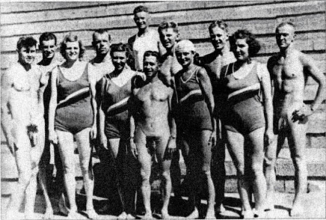 We end with another authentic photo taken by LIFE photographer Alfred Eisenstaedt in 1937, showing Yale swim coach Bob Kiphuth. Although they might not have had mixed-sex nude swim teams as shown in the fake photos, the men and boys in that era actually were unashamed males.