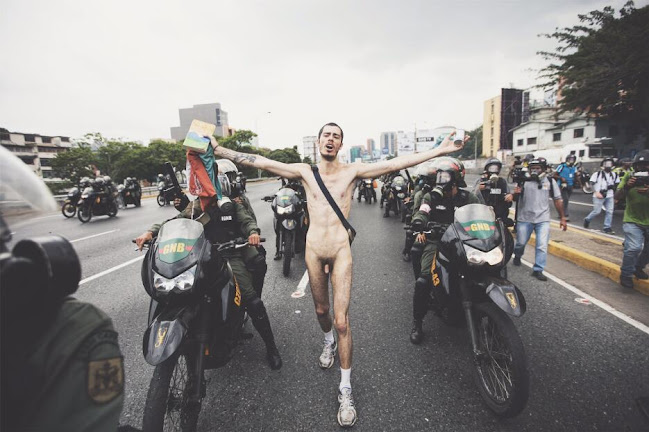 Protests continued the following day. In the capital, Caracas, a young man stripped naked, and armed only with a Bible, walked down the Francisco Fajardo highway to confront the National Police (above).